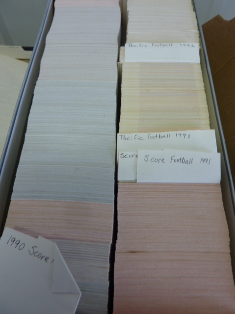 three boxes of football cards, from the 80s to the newest one looks to be from 1992