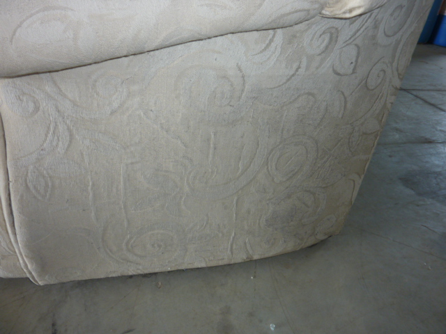 light colored love seat and ottoman, not torn up but it has some marks as you would expect from any light colored furniture. I have taken pictures of the marks.